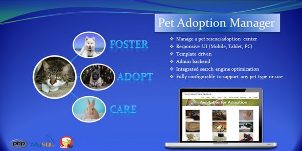 The Pet Adoption Manger script is now available for sale. This script allows you to manage a pet adoption center, pet foster care or any animal shelter. For details about pricing and the release date, please contact us. The script supports a rich back end admin area to allow you to manage your pets, pet categories, blog and just about every aspect of your site. See the live demo to see the full features of both the front end and the back-end.