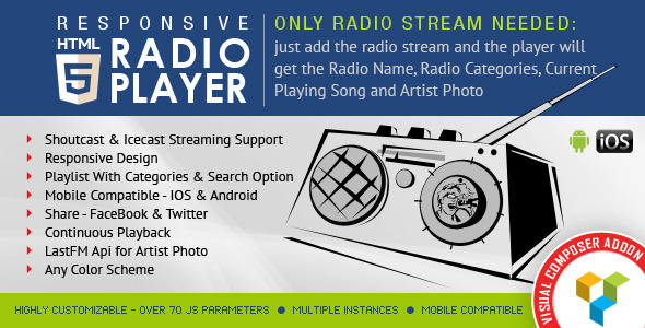 This Visual Composer Addon – HTML5 Radio Player is all you need from a radio player: ShoutCast & IceCast support, categories, search, LastFM API support and more.